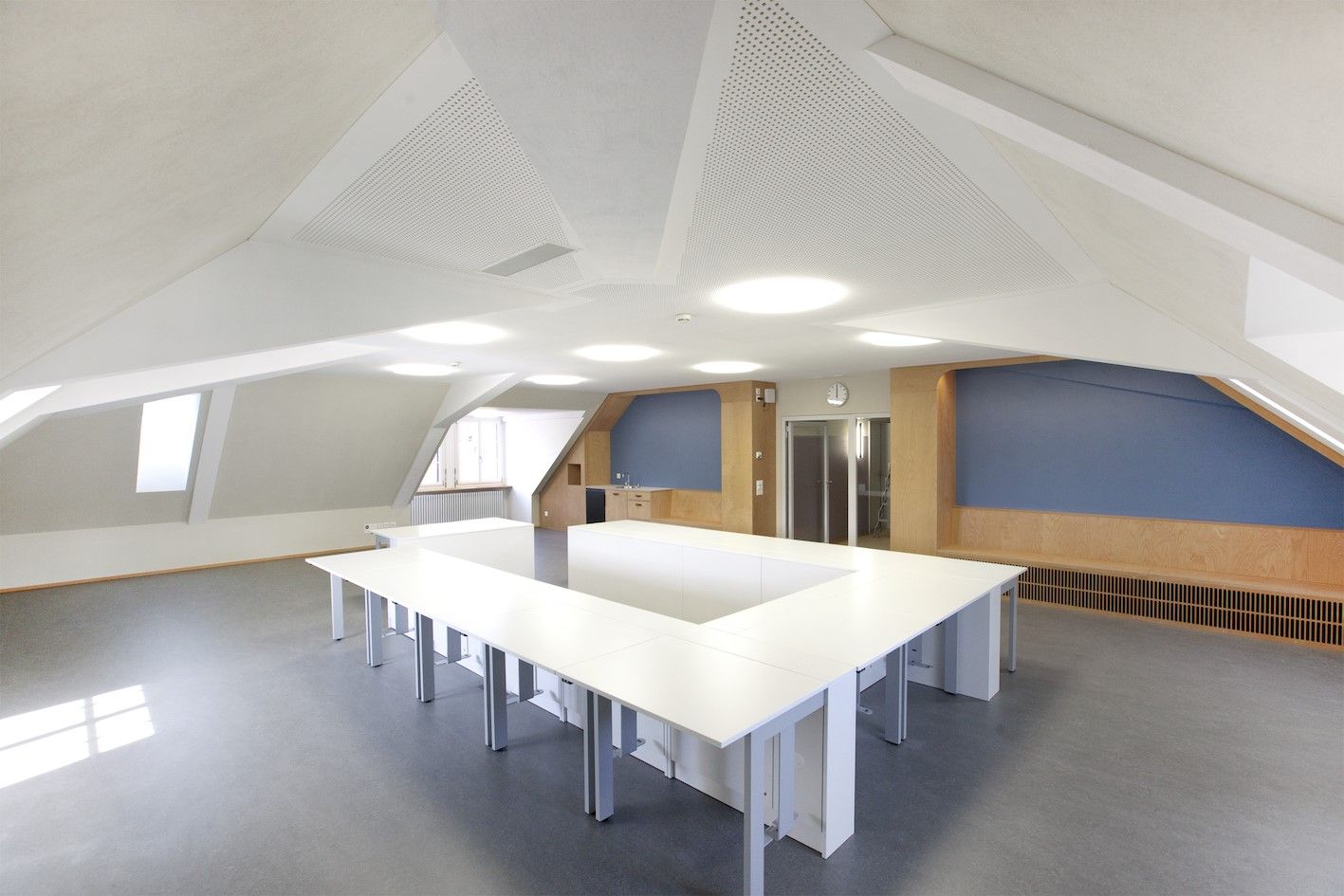 Das Dachgeschoss entsprach nicht mehr den Bedürfnissen der ipw. Da es sich nicht in einem angemessenen Bauzustand befand, wurde es umfassend saniert und in ein vollwertiges Bürogeschoss mit einem Schulungsraum umgewandelt. Spezielle Berücksichtigung galt der Denkmalpflege und der feuerpolizeilichen Auflagen.